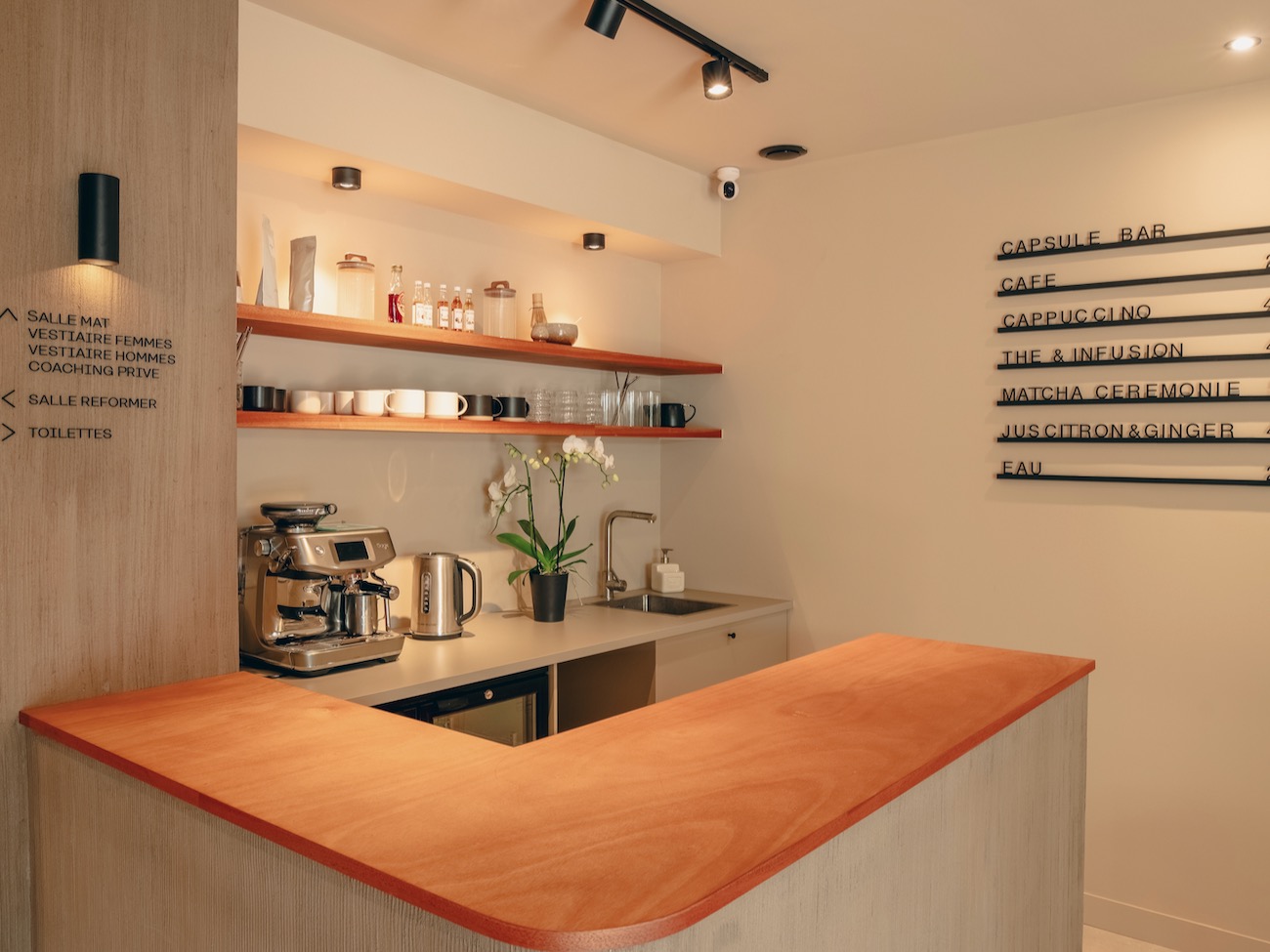 Sur la gauche, un mini salon, séparé par des panneaux japonisants, jouxte une salle lumineuse où s’alignent huit machines Reformer. Sur la droite, un espace façon lobby dévoile une longue table ovale et un comptoir raffiné, à la fois desk d’accueil et bar pour savourer une vaste palette de potions bien senties.