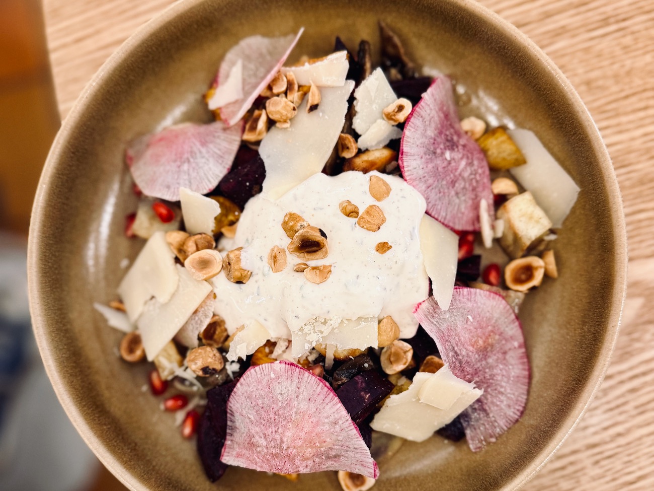 Le tout accompagné d’une salade colorée mêlant radis en fines rondelles et lamelles de carotte, relevées d’une vinaigrette délicate. Il nous tarde de revenir pour la salade de saison aperçue sur la table voisine, véritable tableau.