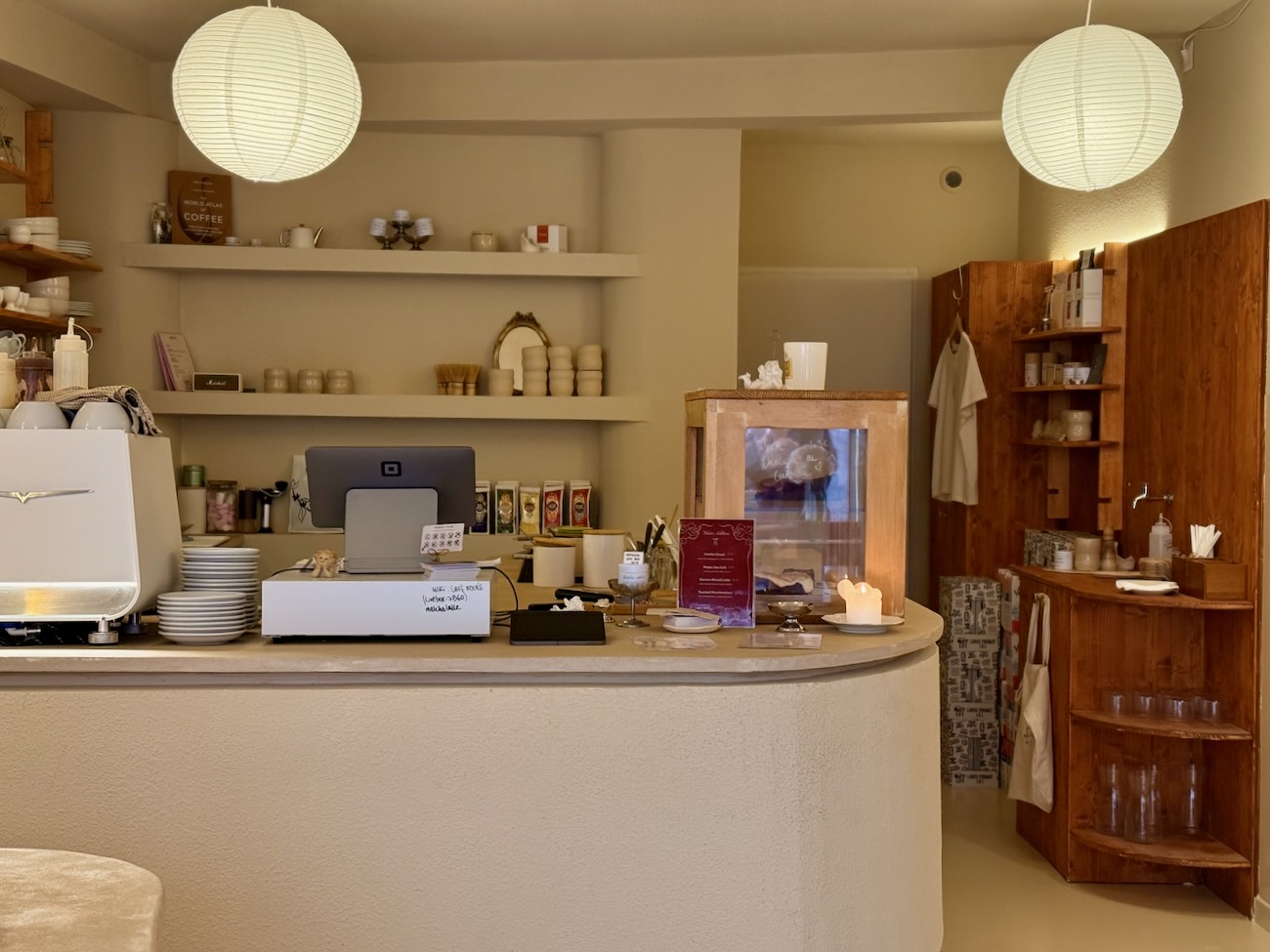 Pour accompagner ses breuvages, Maya propose au petit matin plusieurs options de petits déjeuner et expose tout au long de la journée – dans une petite vitrine lovée sur son comptoir au design très organique – des cakes et cookies faits maison.