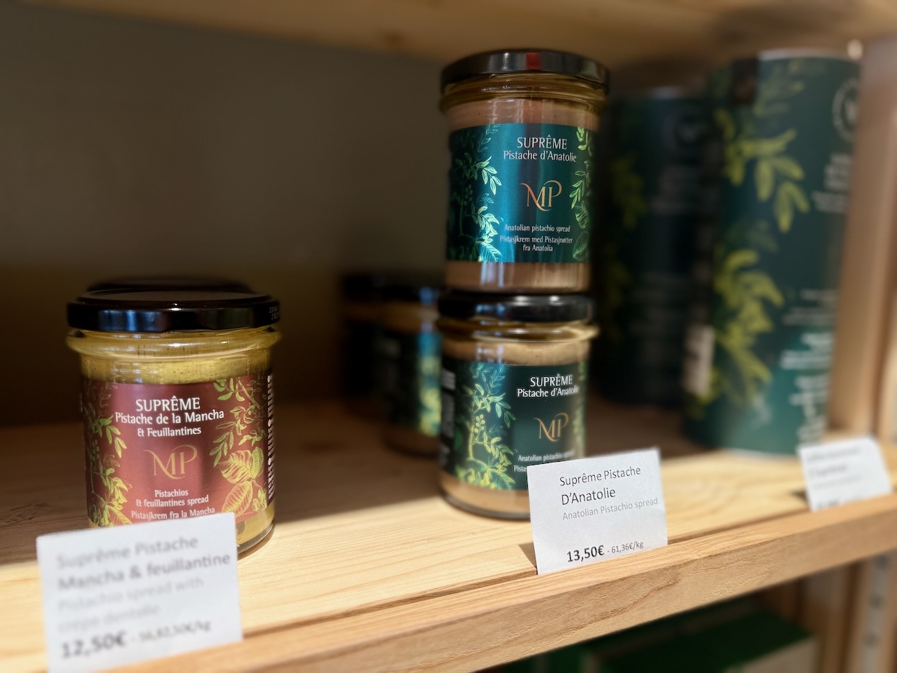 La boutique aligne quatre créations produites à Valensole : une pistache de Sicile, une pistache sauvage aux accents salés et épicés qui fait souvent l’unanimité, une pistache de Turquie aux notes plus florales et boisées, et enfin une recette à la fleur d’oranger qui, en une bouchée, nous transporte à Beyrouth.