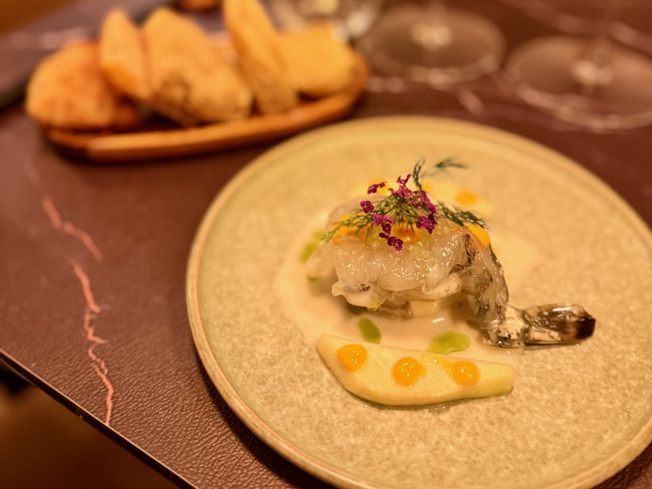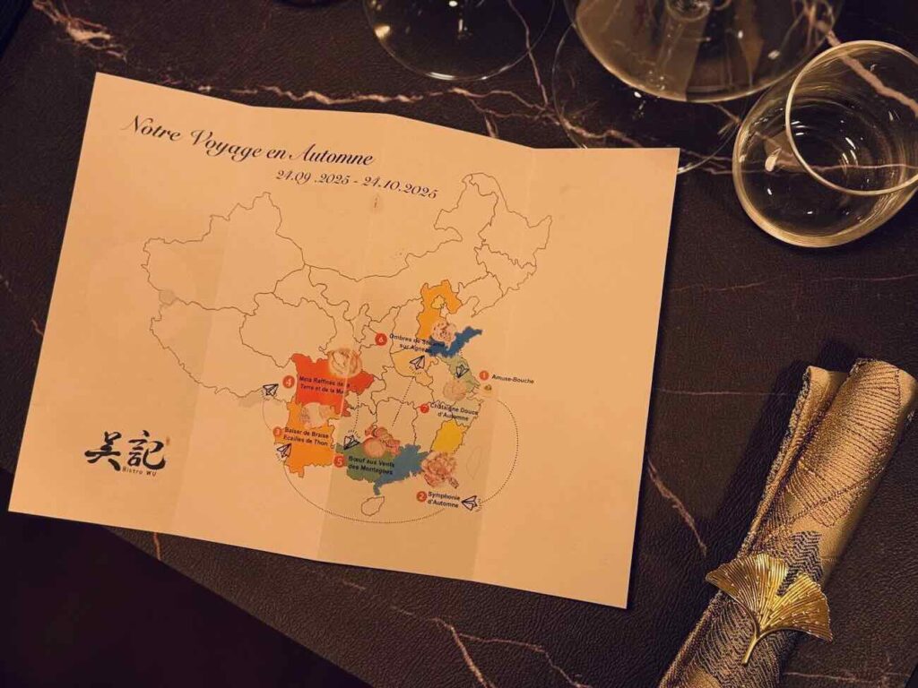 Pour nous ce sera, une ode à la saison automnale conjuguant raffinement et créativité. Dès l’« Amuse-Bouche » jusqu’à la châtaigne déclinée en dessert, la dégustation évoquait le dialogue entre tradition chinoise et touches contemporaines, invitant à la découverte et à la contemplation. Le service attentif, la vaisselle élégante et l’harmonie des saveurs ont transformé ce repas en véritable moment suspendu, où chaque bouchée racontait la poésie de la saison. Mention spéciale pour la crevette tigre sublimée par de savoureux morceaux de poire et de délicates perles de citron caviar.
