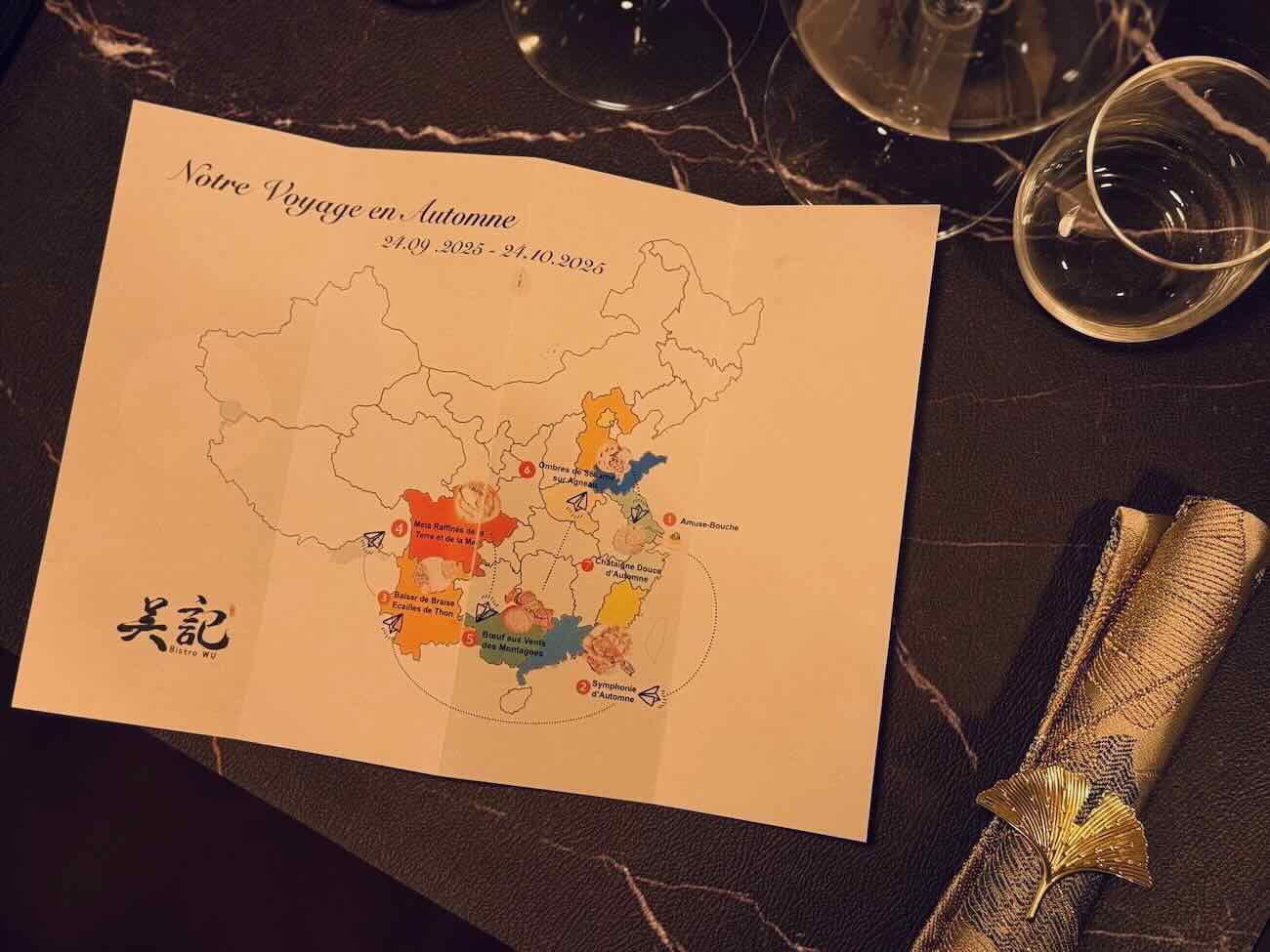 Chaque expérience débute par la réception d’une carte de la Chine sur laquelle apparaît un voyage qui compte autant d’escales que le nombre de plats figurant au menu de notre choix.