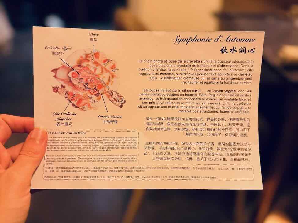 Chaque plat sera ensuite précédé d’une fiche technique délicatement illustrée expliquant le mets, le processus de création et les vertus de chaque ingrédient pour celui qui les déguste. Force est de constater que la profondeur gastronomique chinoise, la richesse, la diversité des traditions et saveurs issues du « centre du monde » pousse à l’humilité.
