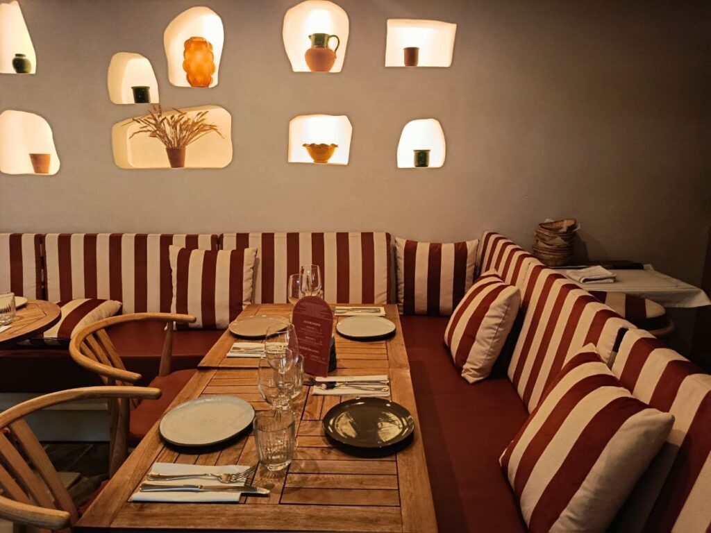 Côté déco, l’enseigne est une propulsion-immersion dans la scénographie sicilienne : des rayures, des céramiques artisanales, du bois, du cuir lissé, des pierres plates au sol, des masques traditionnels, des citronniers … Amélie, passionnée de design d’intérieur, a pensé chaque matériau, imaginé chaque détail pour que le voyage soit complet.