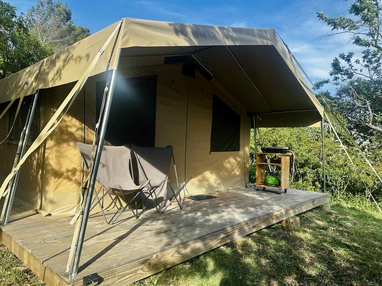 Très tôt, la marque fait le choix de concevoir ses propres hébergements en toile et en bois, pensés pour se fondre dans la nature.