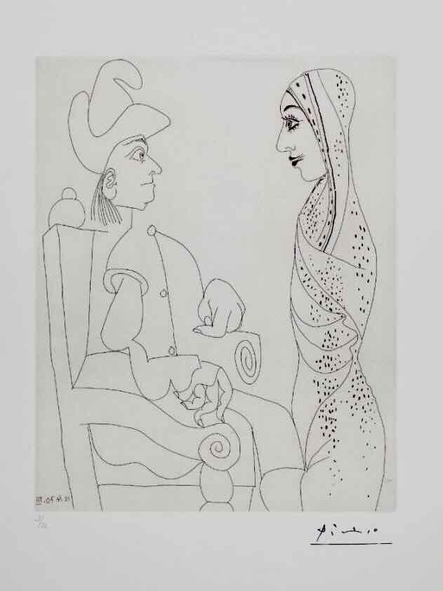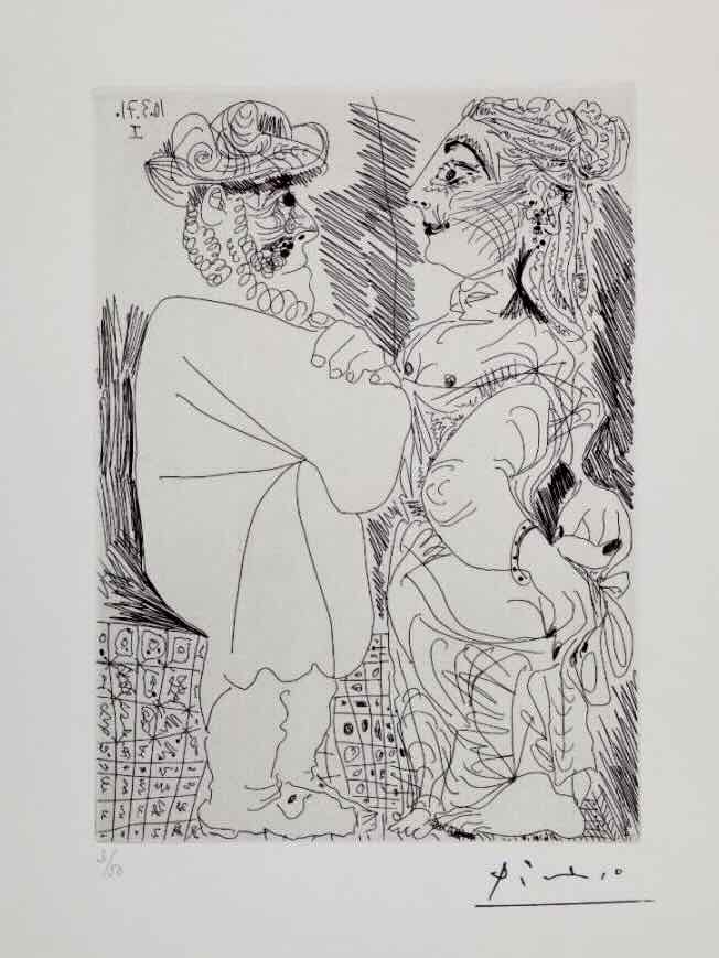 Dans ces plaques gravées, Picasso explore l’énergie du trait, l’expressivité du corps, l’improvisation pure. Ce sont des œuvres où l’humour côtoie l’érotisme, où le geste semble parfois jouer avec la fulgurance de l’esquisse. Cette série témoigne de sa virtuosité technique, mais surtout de la vivacité d’un regard qui n’a jamais vieilli. À travers Les 156, on découvre un Picasso joueur, libre, affranchi du cadre muséal, pleinement vivant.