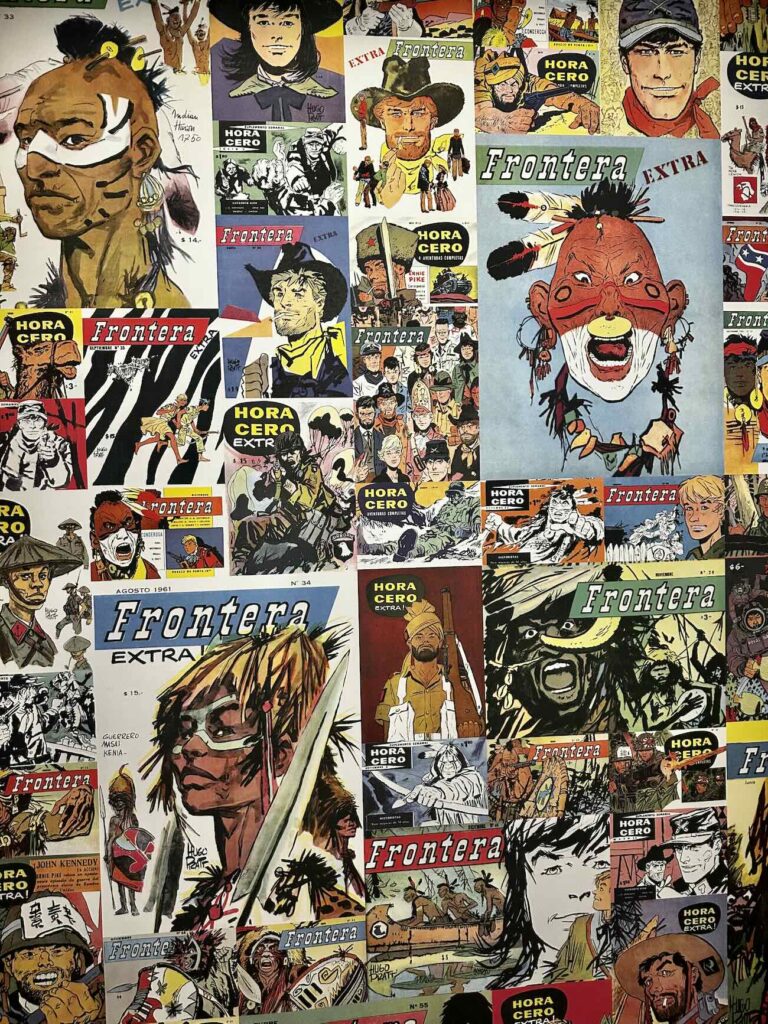 Planches, reproductions, fragments narratifs : tout s’entrelace pour raconter une œuvre profondément marquée par le voyage. Afrique, Europe, Amérique du Sud… Chez Pratt, la géographie n’est jamais un décor, mais une matière vivante qui nourrit le récit.